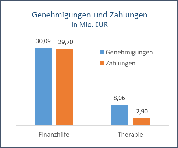 Es wurden 30,09 Millionen Euro Finanzhilfen zugesprochen und Therapiekontingente im Ausmaß von rd. 8 Millionen Euro bereitgestellt.